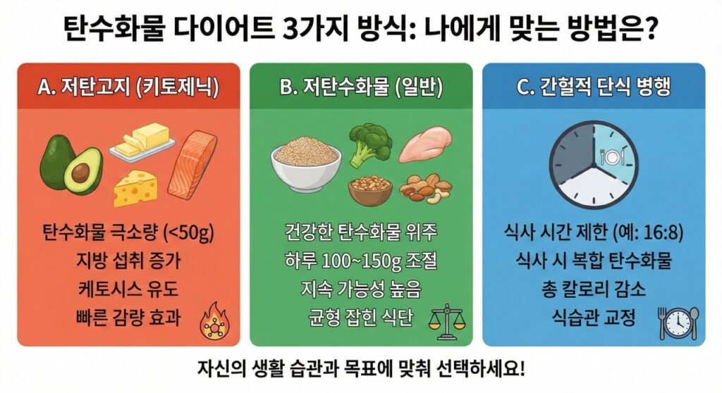 탄수화물 다이어트 3가지 방식: 키토/저탄수/간헐적 단식 병행